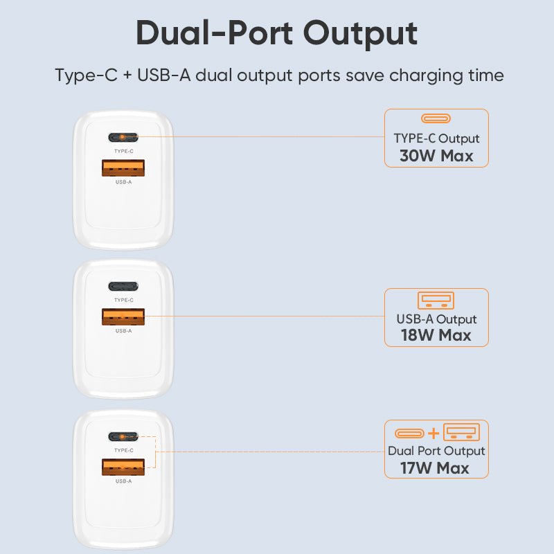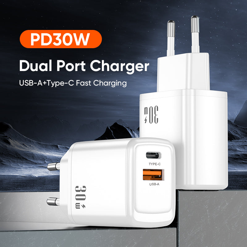 Dual‑Port 30W Fast Charger | Type‑C PD + USB‑A QC Wall Charger | White