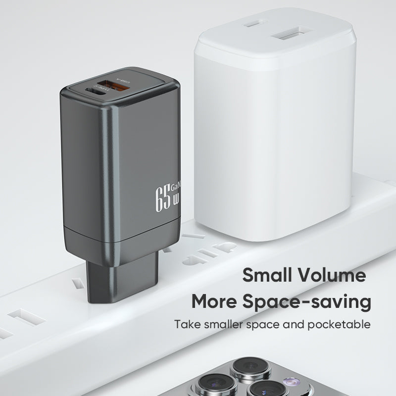 Dual‑Port 65W GaN Fast Charger | Type‑C PD + USB‑A QC Wall Charger | Black
