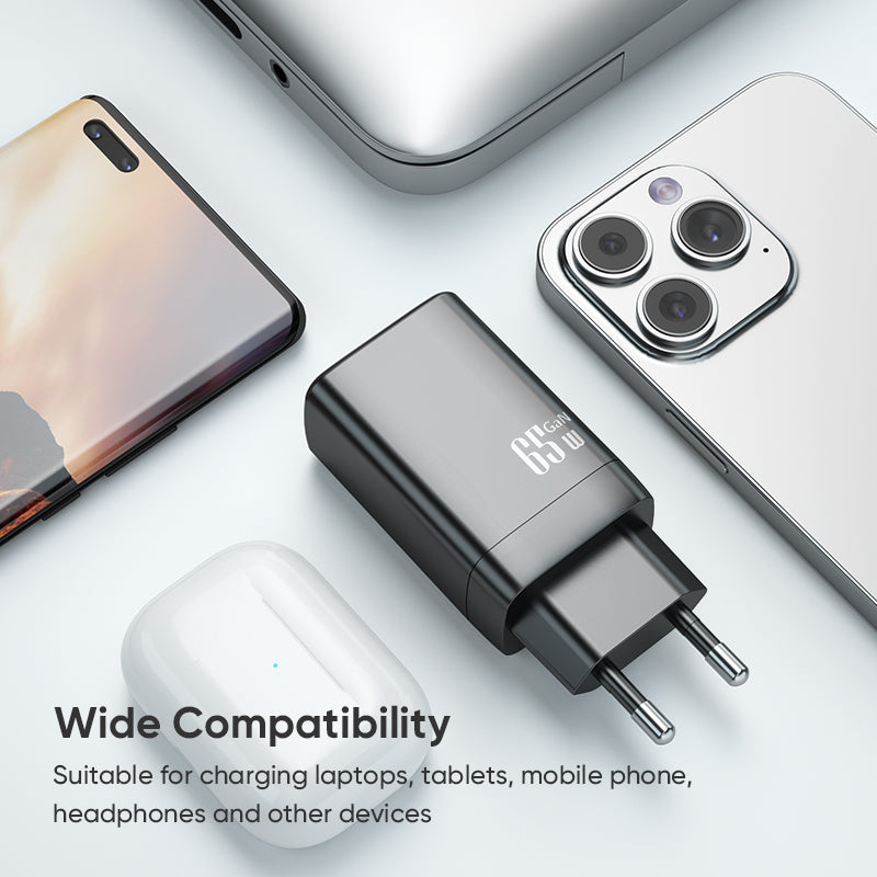 1 x DLifesa Dual‑Port 65W GaN Fast Charger | Type‑C PD + USB‑A QC Wall Charger | Black (EU 2 Pin Plug).
