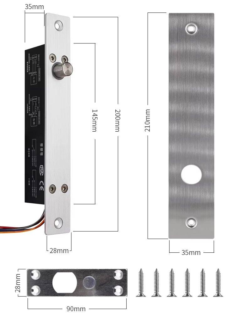 Dimensions: Box: 233 x 85 x 43mm | Face Plate: 20.0L x 2.8W x 4.1H (cm) | Strike: 9.0L x 2.5W x 0.2H (cm) | Bolt: 1.6cm DIA, stainless steel 1.6cm throw.