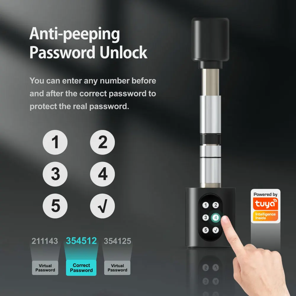 Password Peeping Prevention function allows you to input a random number then your password then random numbers and once you press the # key then it will register the correct password for example; XXXX CorrectPassword XXXX (X being Random Numbers) Max 12 Digits.