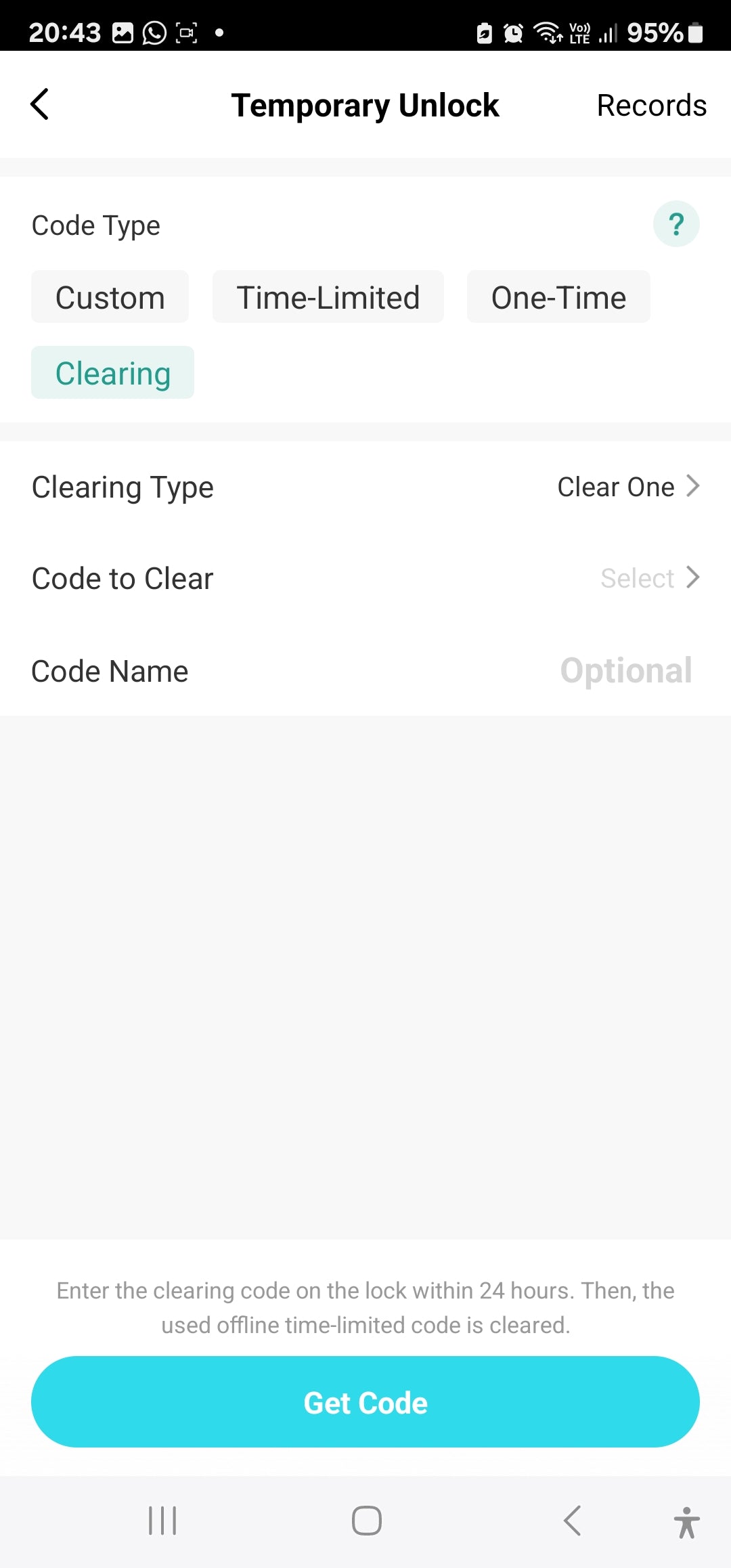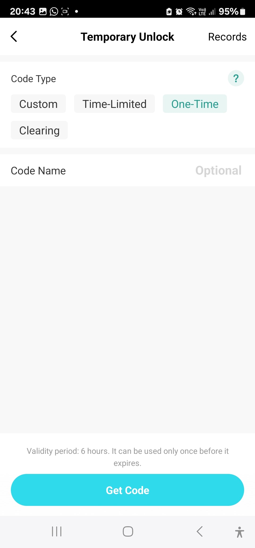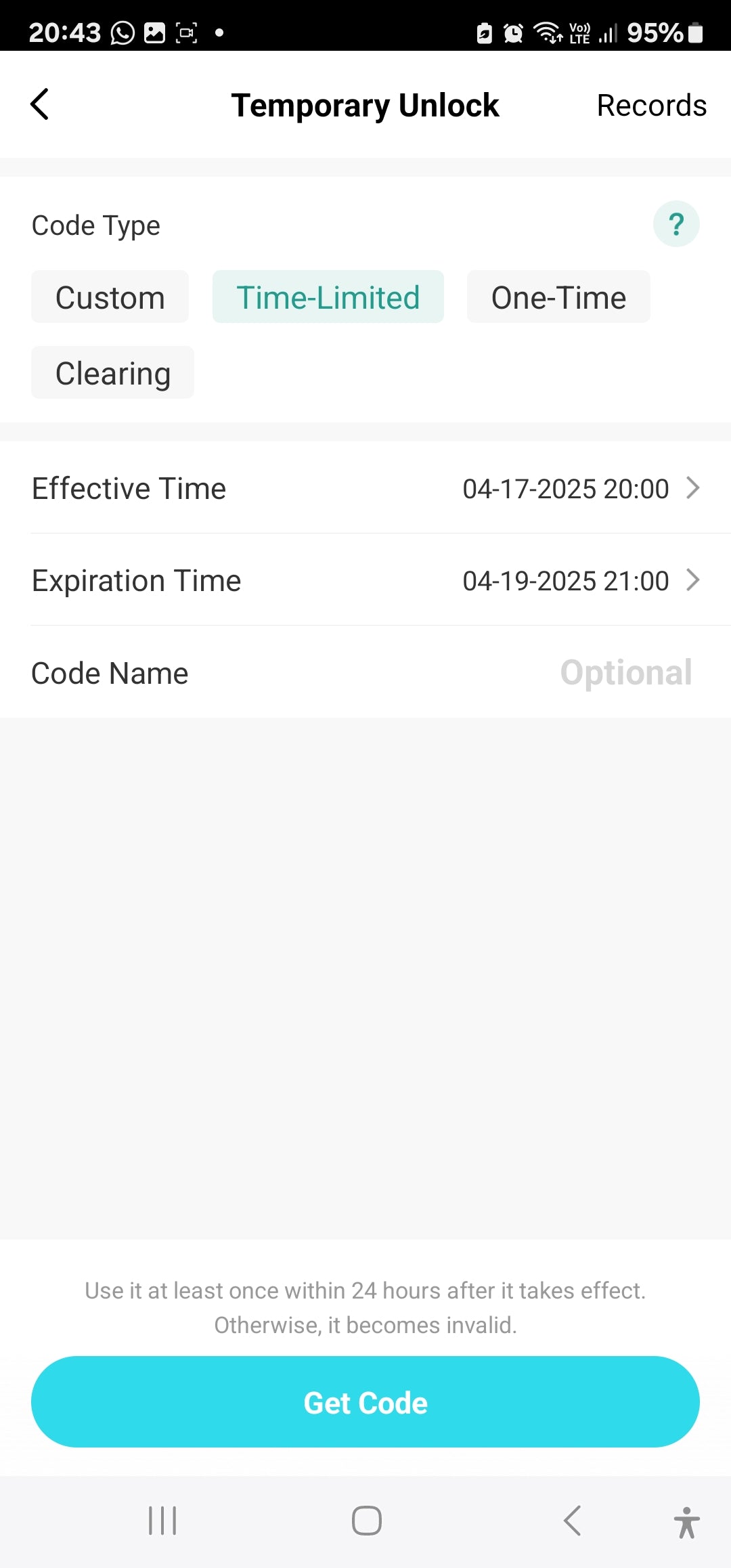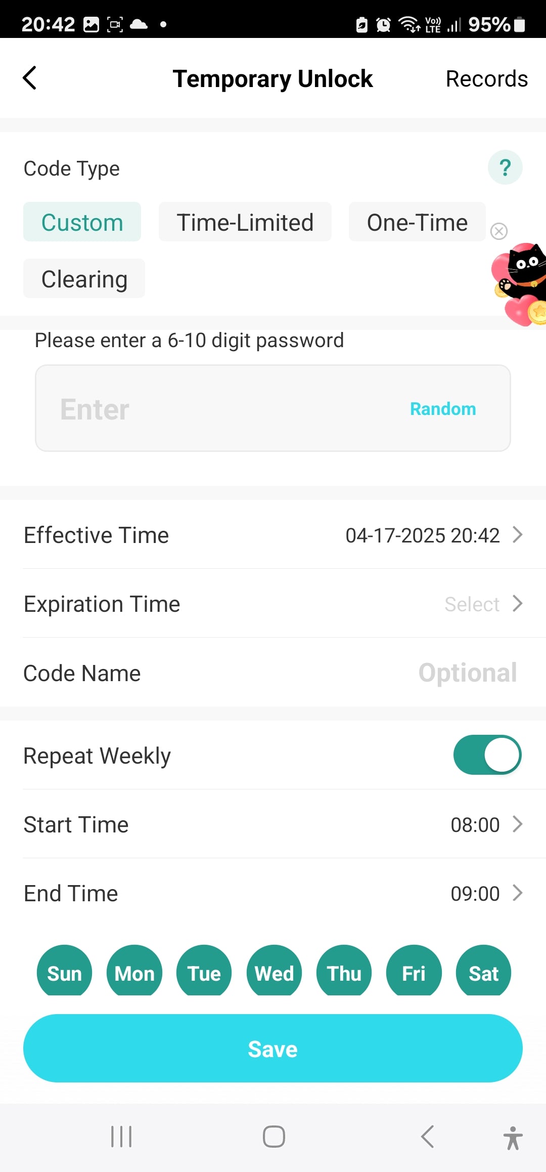 Temporary Code: Custom: Set Start & End Date & Time with Start & End days & time . Input your own 6-10 Digit code or randomly generate a 6-digit code | Time-Limited Password: Set Start & End Date & Time. Auto-generates a 10-digit code | One-Time Password | Clearing Code: to Clear a Password or All Passwords.