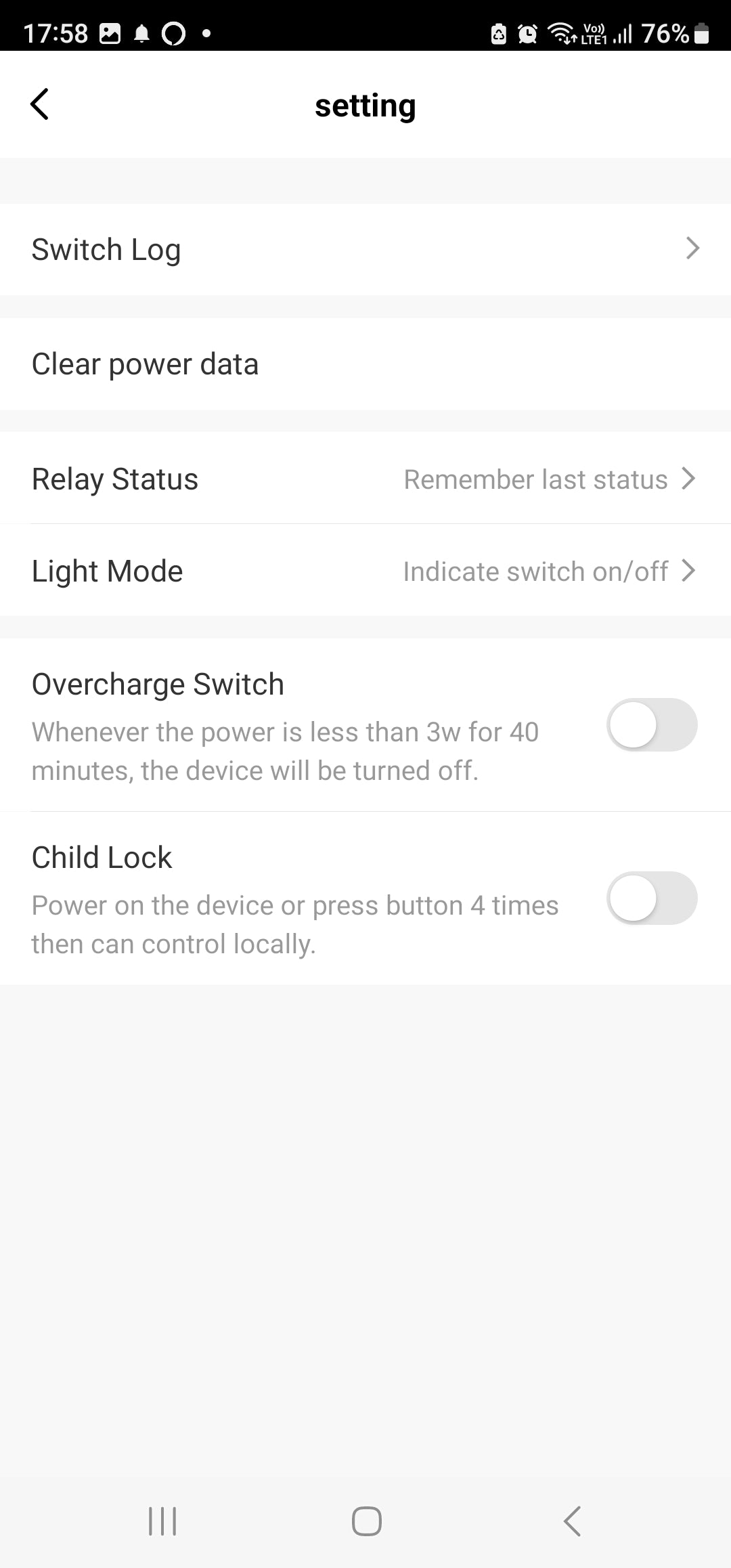 Settings: Switch Log | Clear Power Data | Relay Status | Light Mode | Child Lock.