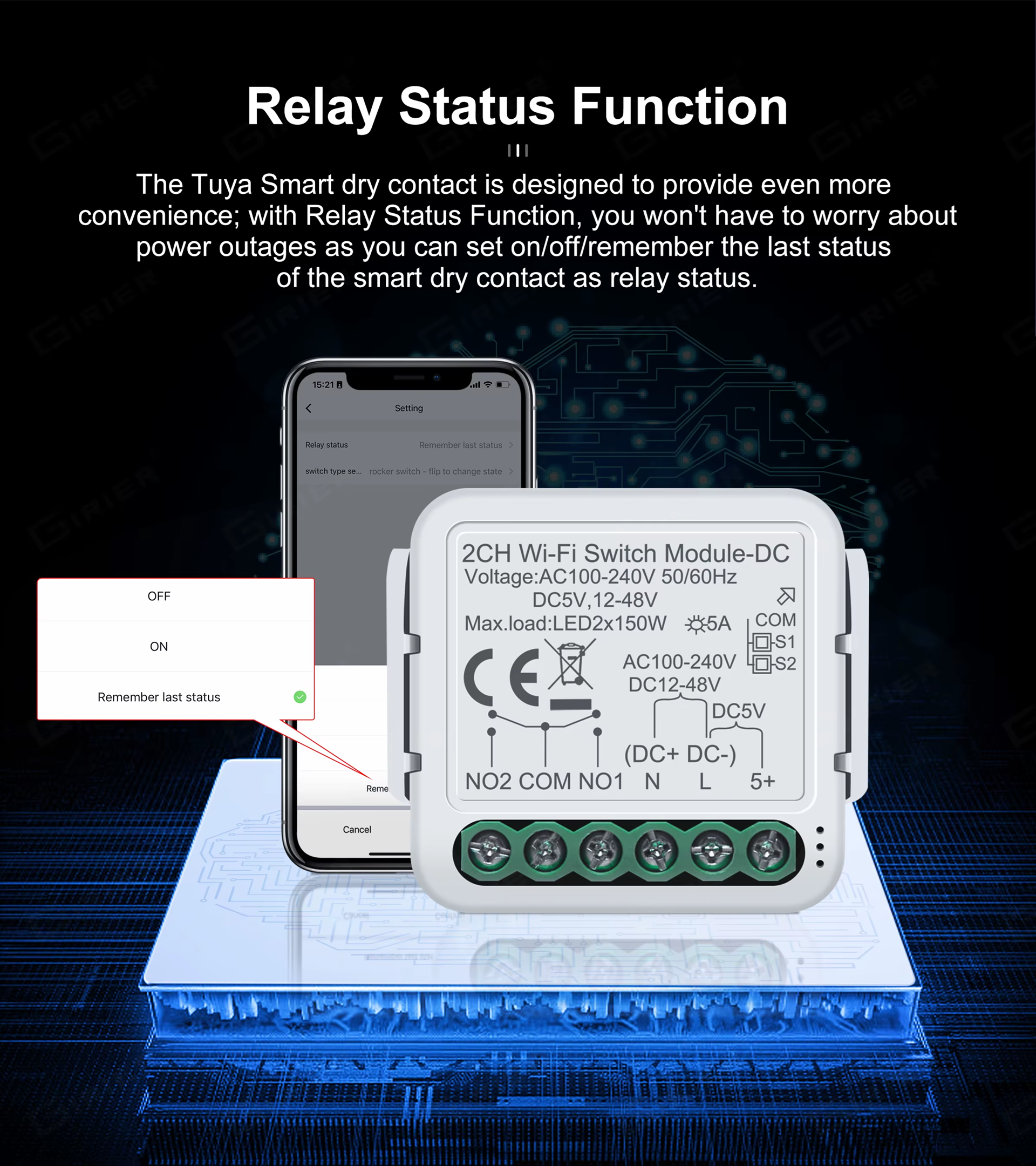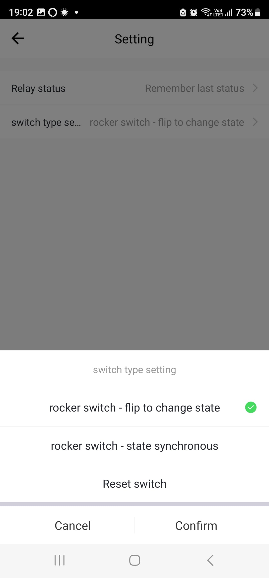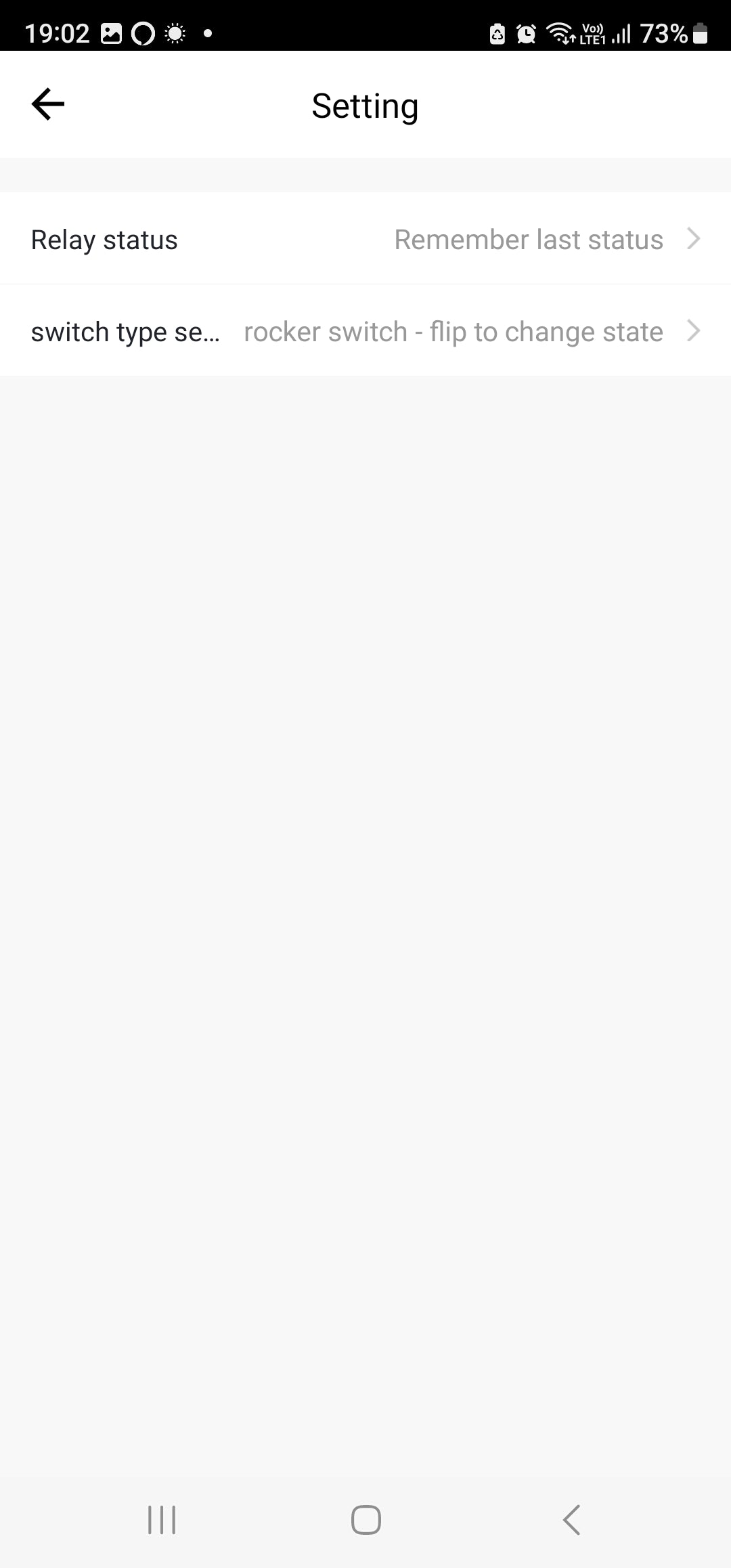 Settings: Relay Status After a power cut, the relay should turn OFF, ON, Remember last status. | Switch Type Setting (Rocker switch - flip to change state, Rocker switch - State synchronous, Button Switch)