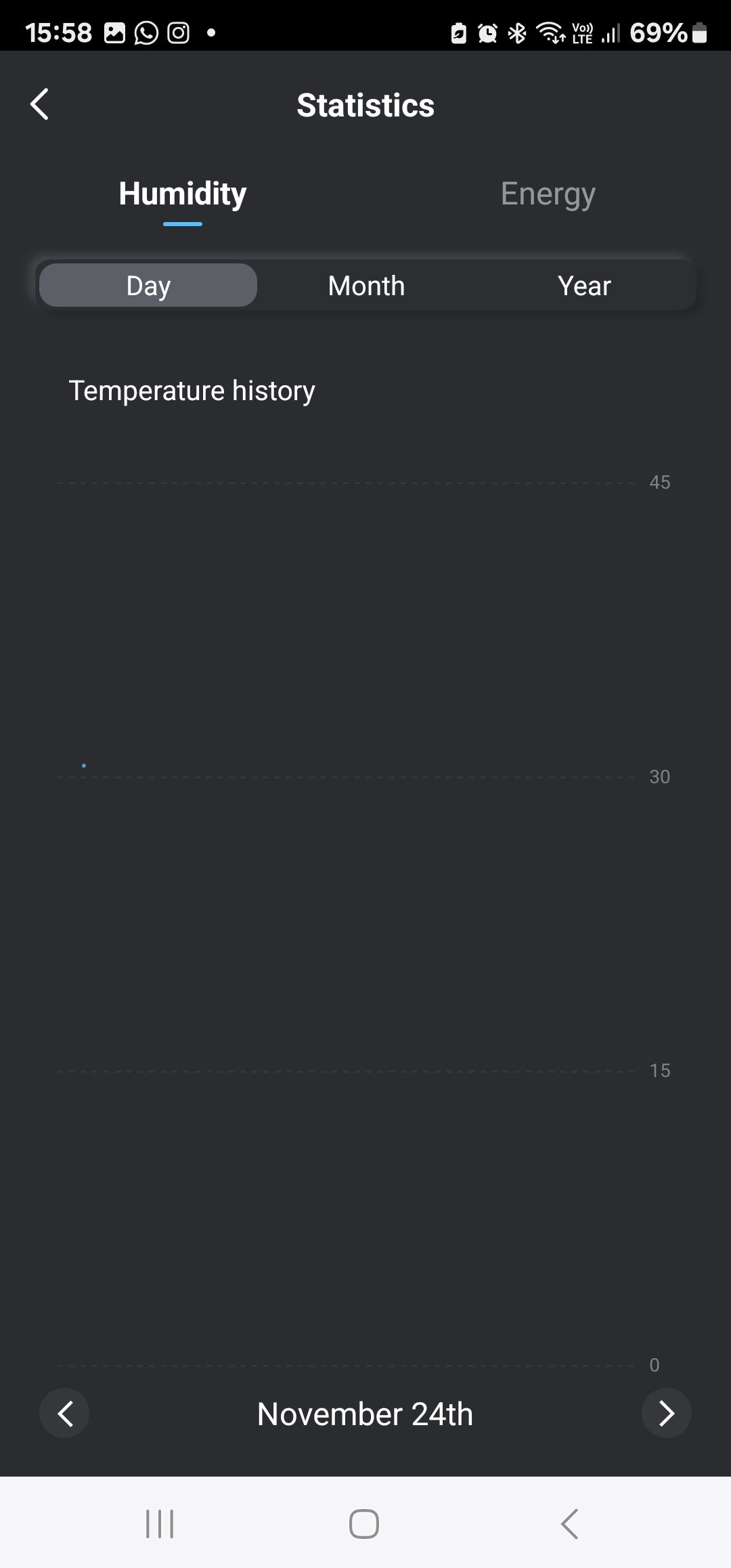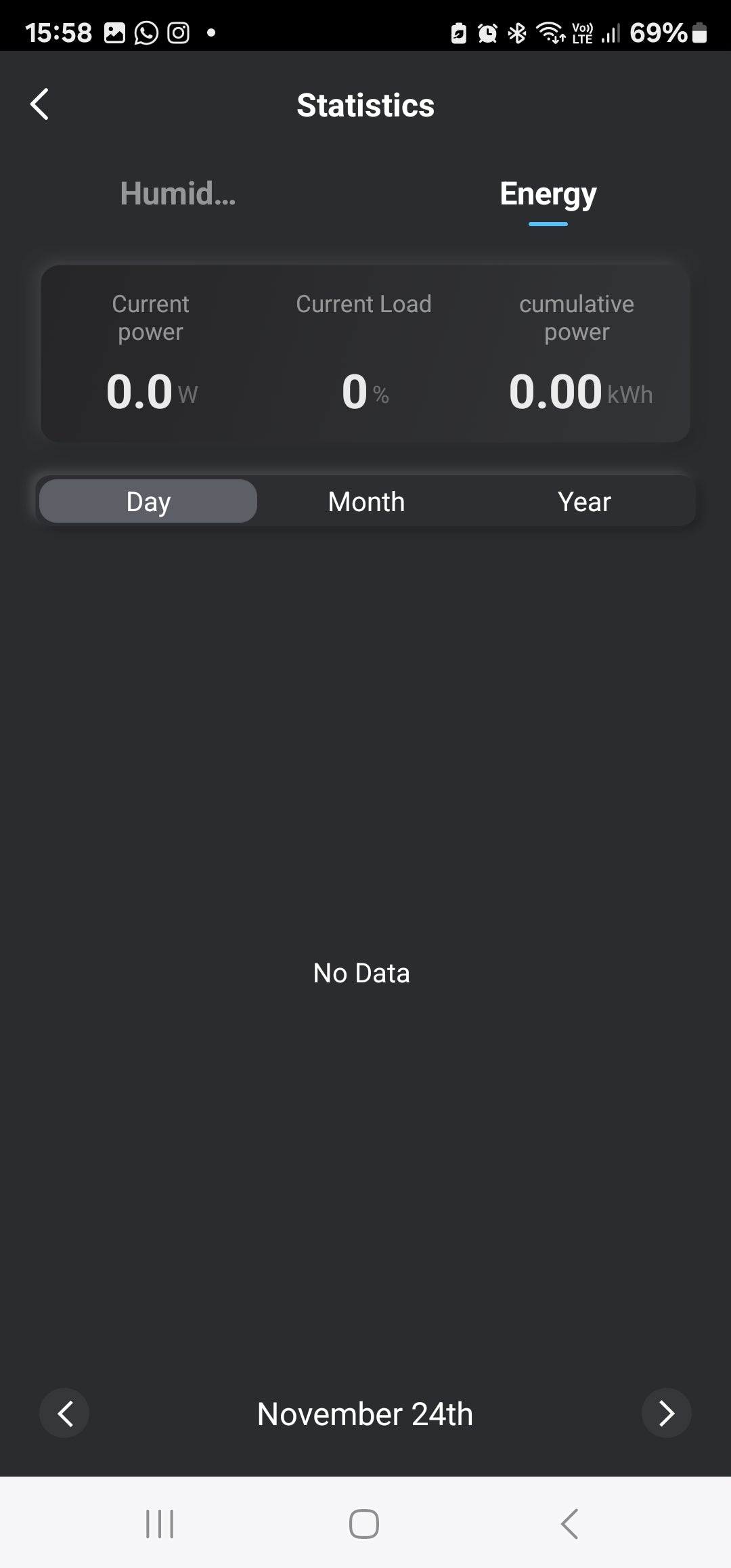 Statistics: Temperature Line graph (Day, Month, Year) | Current Power Wattage, Load Percentage & Cumulative Power Usage | Energy Line graph (Day, Month, Year).