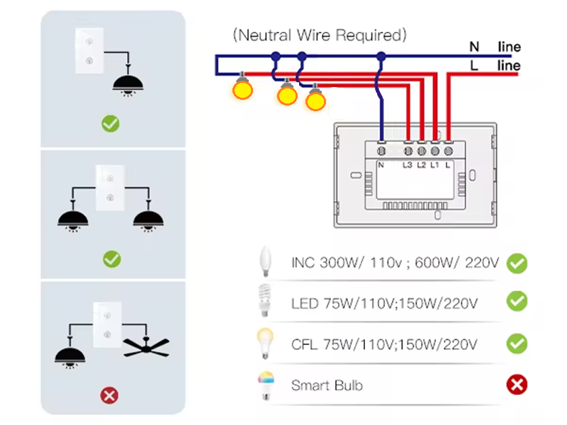 Please note the wire connection is Live & Neutral input to the WiFi Dimmer Switch. Please check your wiring if you have both Live and Neutral wire present at your current wall switch before purchasing.