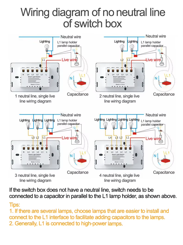 2-way wire connection; Live with Neutral or Live without Neutral (without neutral, the included capacitor must be used).
