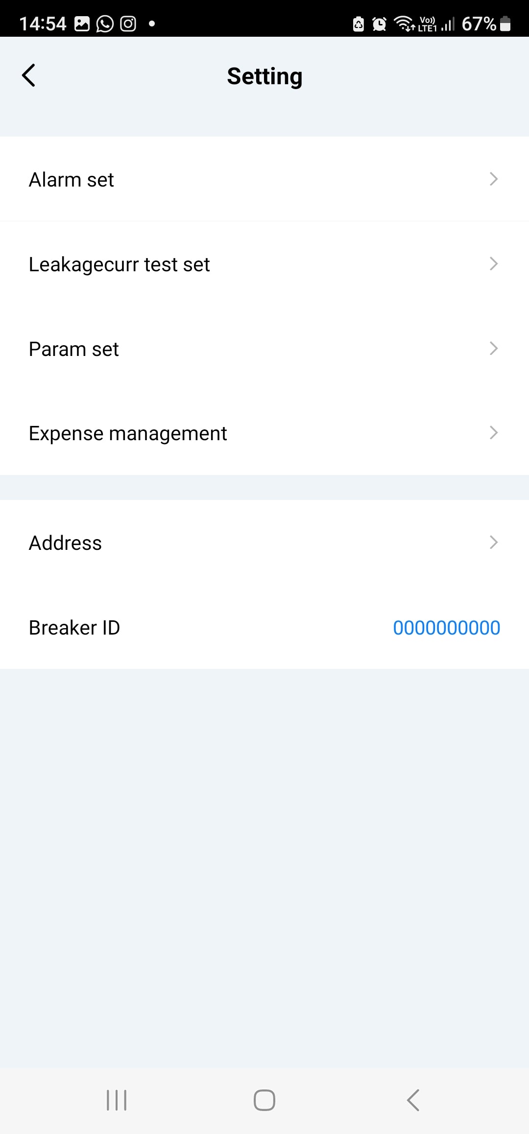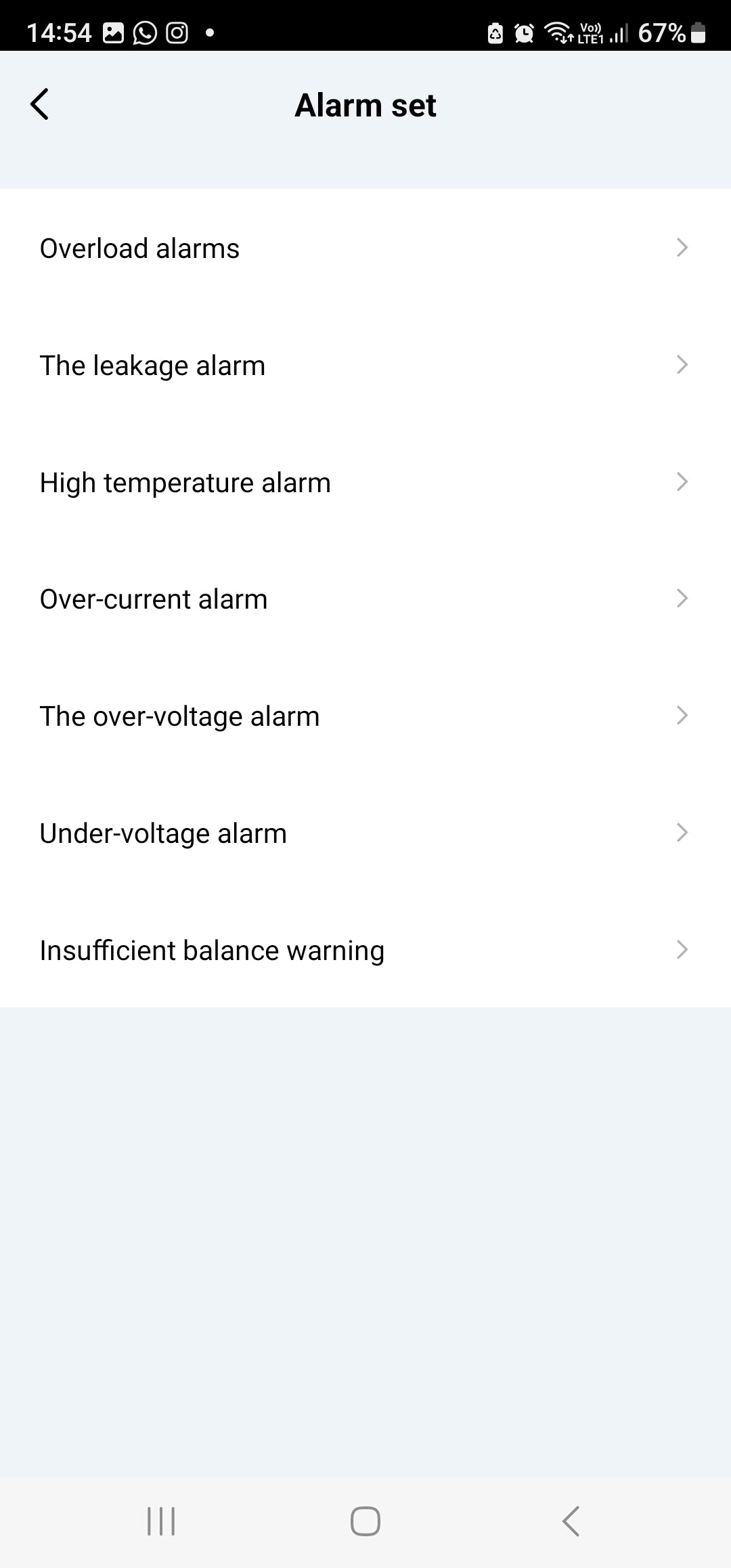 Settings: Alarm Set: Overload | Leakage | High Temperature | Over-Current | Over-Voltage | Under-Voltage | Insufficient Balance warning. Each can be turned ON/ OFF and set thresholds.