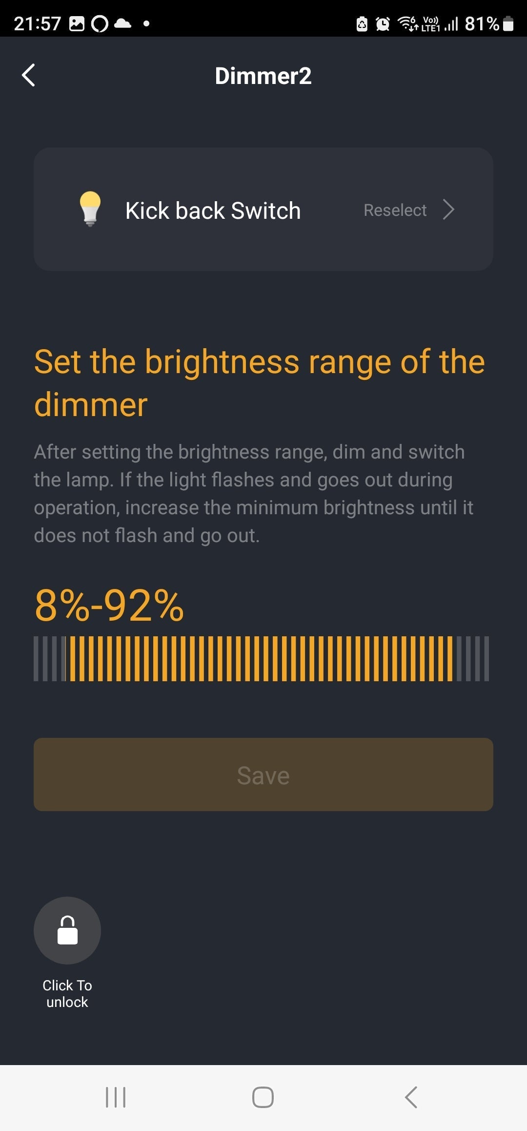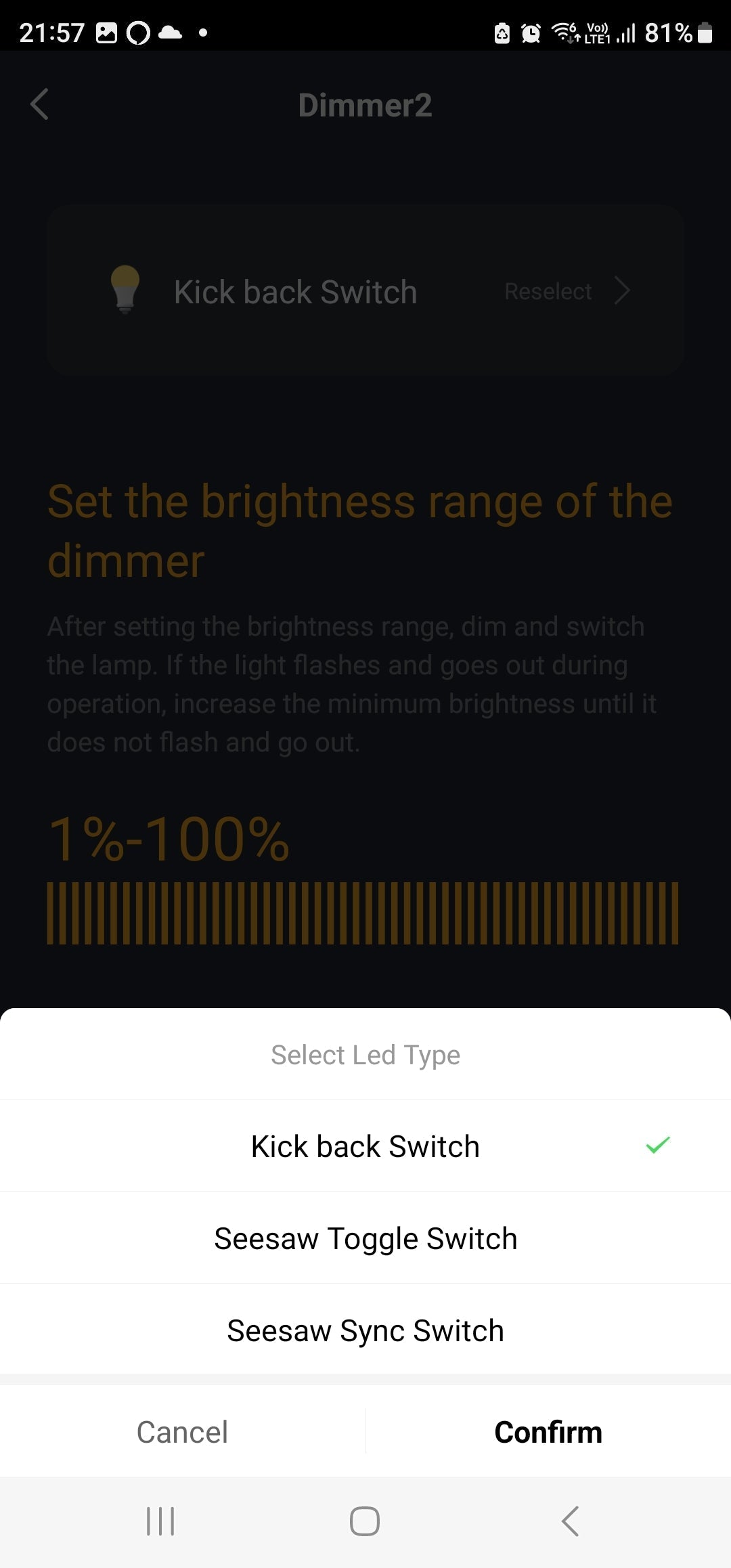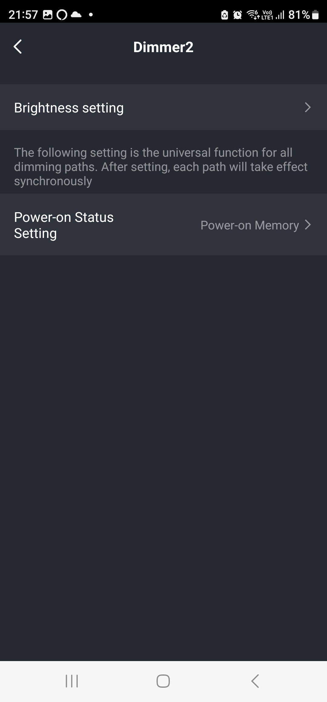 Settings: Brightness: Kick Back switch, Seesaw Toggle switch, Seesaw Sync Switch | Brightness Range (Set the lowest and highest point that the Bulb can handle) | Power-on Status (On, Off, Memory). After the Power cut of this switch then the switch turns on with the selected Status.