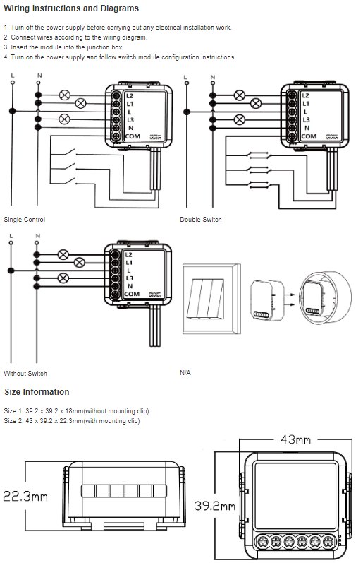 Please note the wire connection is Live & Neutral input to the device. Please check your wiring if you have both Live & Neutral wire present at the switch before purchasing. Please also see the Wiring diagrams as per the picture.
