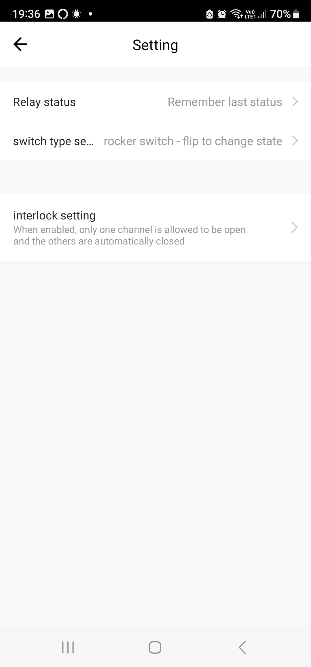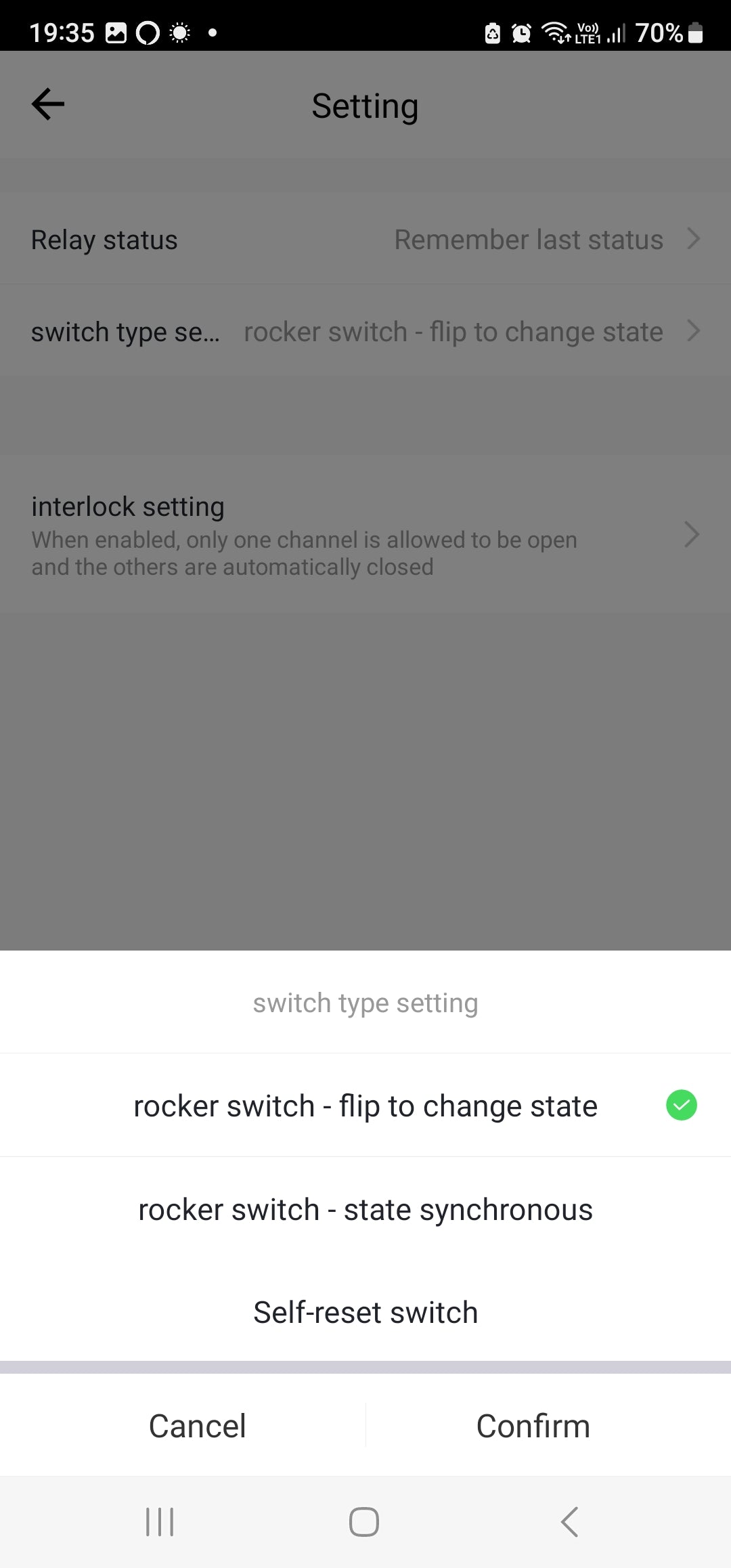 Settings: Relay Status After a power cut, the relay should turn OFF, ON, Remember last status. | Switch Type Setting (Rocker switch - flip to change state, Rocker switch - State synchronous, Self-reset Switch)