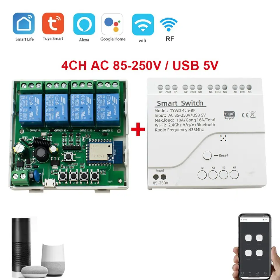 Smart Life Tuya WIFI 4CH 5V / 85-250V Door Gate Garage Opener Inching Relay Module w/ RF433Mhz