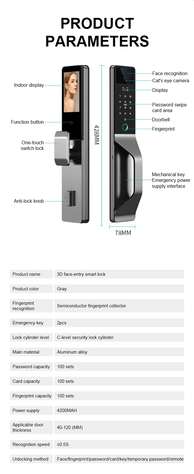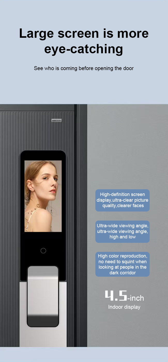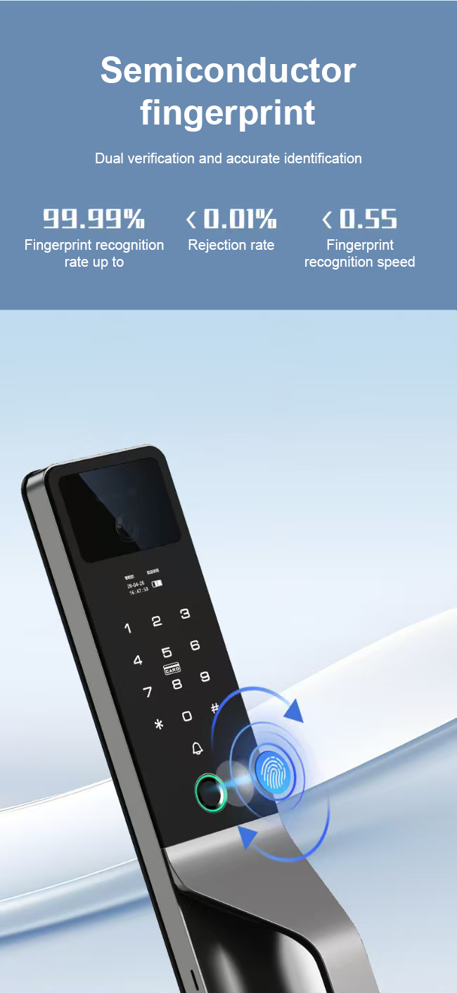 - Unlock by Face, Fingerprint, Key, IC card, Password, or App (Doorbell Button).