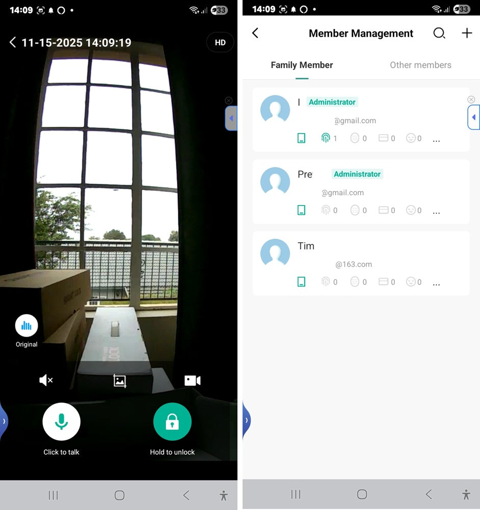 - Member Management: Manage Family Members Faces, Fingerprints, Passwords, Cards. Duress can be enabled on these Methods so if you unlock using a certain Fingerprint, Password, or Card then it will unlock as well as trigger a Notification to the app in case of emergency. Users are added only via the Admin menu on the handle then binded on the app once a unlock is triggered.