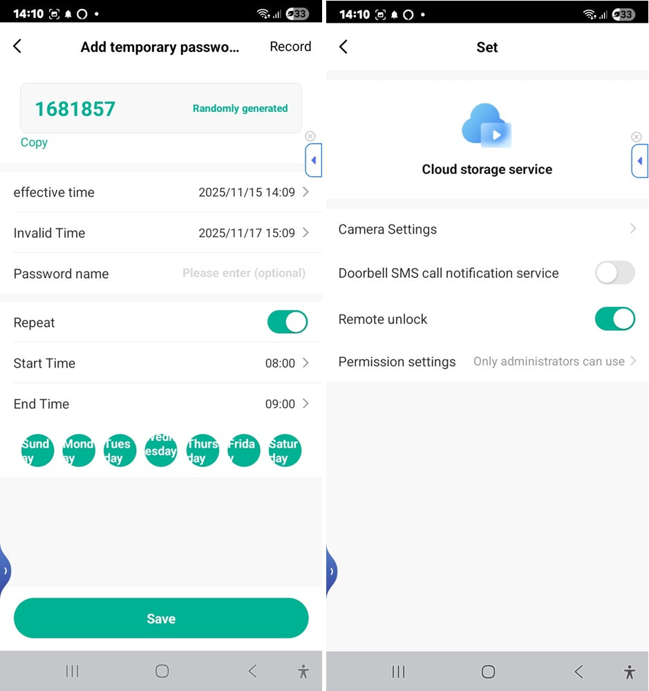 - Temporary Password: Add a password (7-digit password with a Start & expiration date & time and can be repeated on certain days of the week at certain times of that day).
