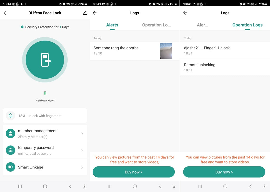 - Logs: Alerts (Doorbell) & Operation (Unlock Records). Only Stores pictures for the past 14 days.