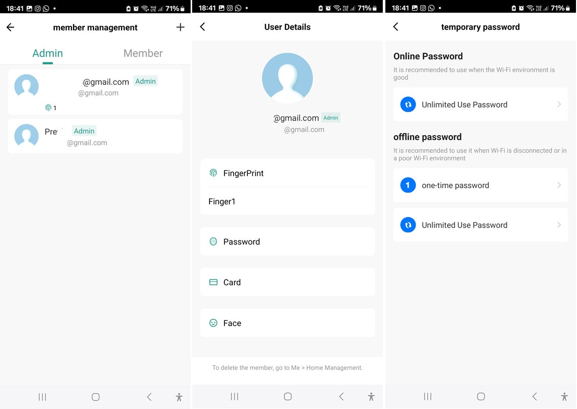 - Member Management: Manage Family Members Faces, Fingerprints, Passwords, Cards. Duress can be enabled on these Methods so if you unlock using a certain Fingerprint, Password, or Card then it will unlock as well as trigger a Notification to the app in case of emergency. Users are added only via the Admin menu on the handle then binded/ Associated on the app once a unlock is triggered.