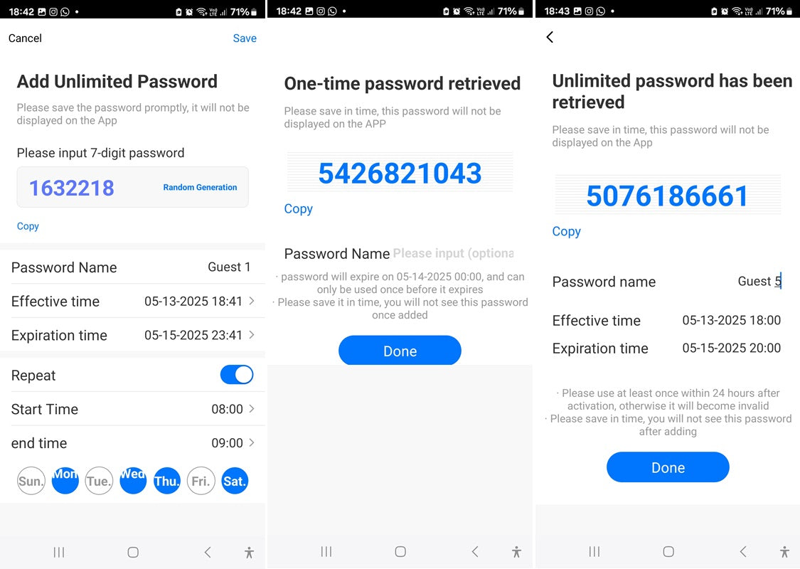 - Temporary Password: Online Unlimited Use password (7-digit password with a Start & expiration date & time and can be repeated on certain days of the week at certain times of that day) | Offline One-time Password (10 digit password that can only be once within 6 hours of generating) | Offline Unlimited Use password (10 digit password with a Start & expiration date & time)