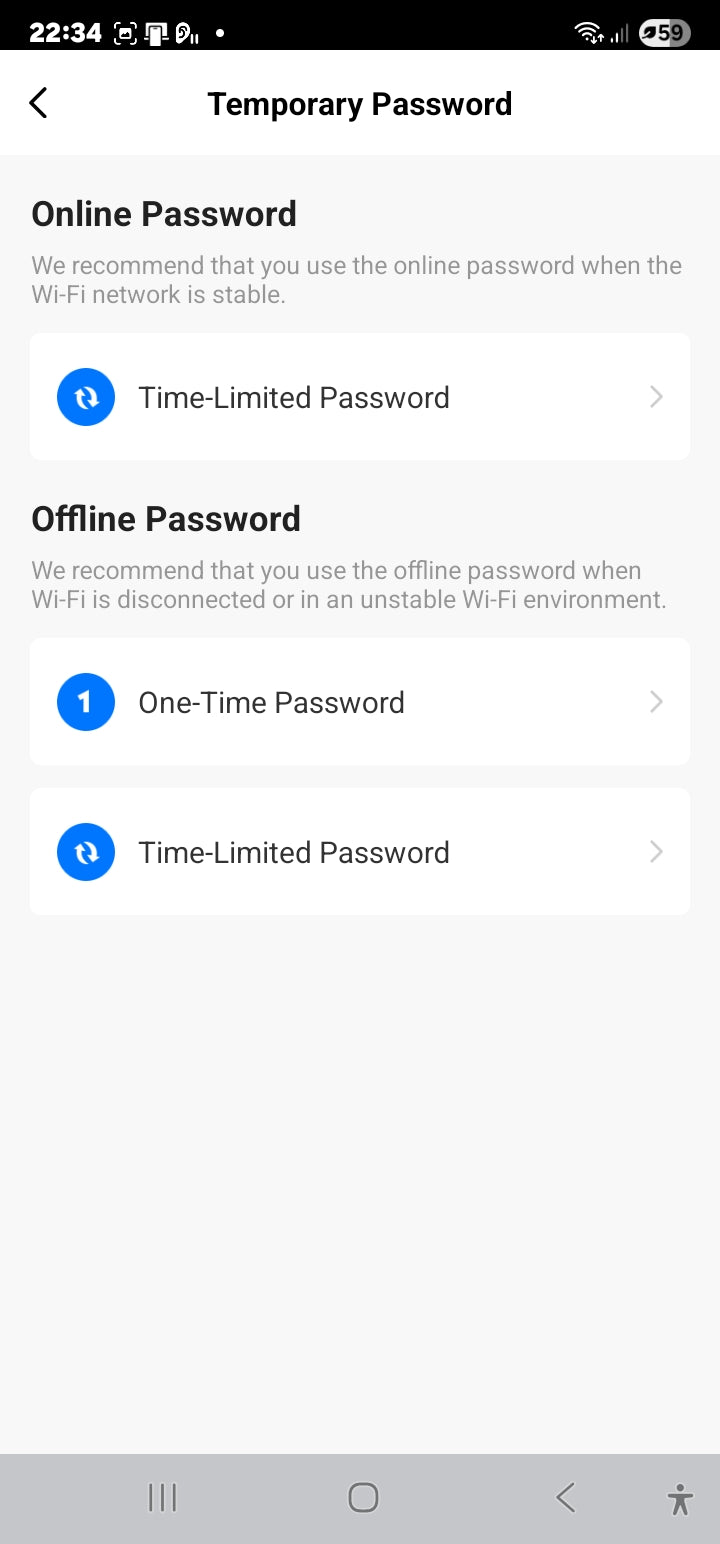 - Temporary Password: Online time-limited password (7-digit password with a Start & expiration date & time and can be repeated on certain days of the week at certain times of that day) | Offline One-time Password (10 digit password that can only be once within 6 hours of generating) | Offline One-time Use password (10 digit password valid for 6 hours from Generation) | Offline time-limited password (10-digit password with a Start & expiration date & time)