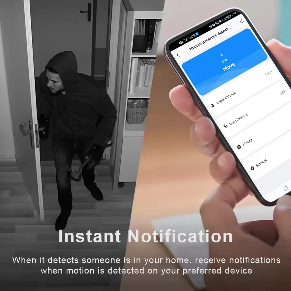 When it detects Presence, it can Alert you via Notification to your Mobile Phone within seconds. Receive a timely warning when there is an intruder or unknown movement in your house. It can also trigger automation at the same time. For use in Homes, Schools, Businesses, warehouses, restaurants, hospitals, etc. Get an alert on your Mobile Phone from anywhere in the world.