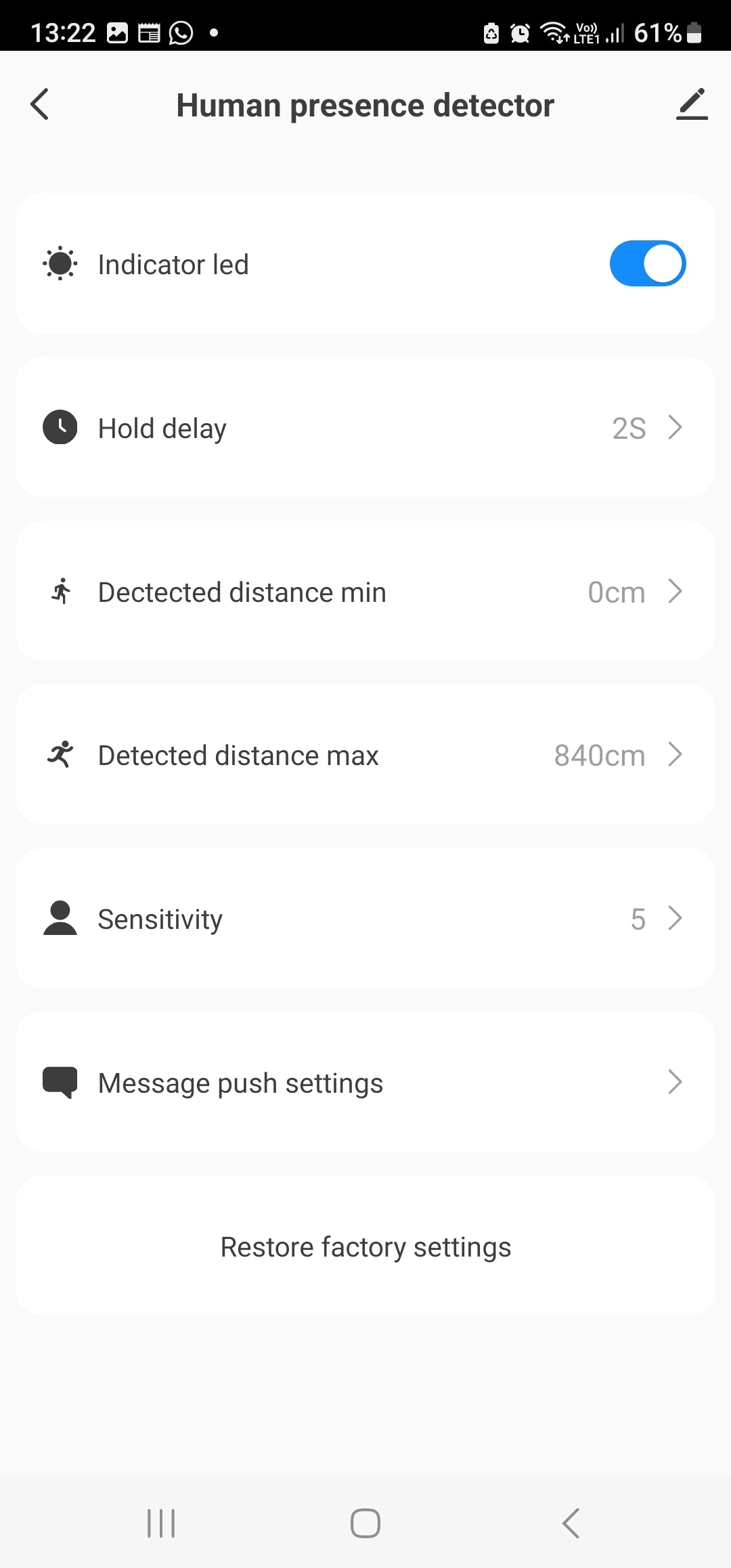 Settings: Indicator LED | Hold Delay | Detection Distance Minimum | Detection Distance Maximum | Sensitivity | Message Push Settings | Restore Factory Settings.