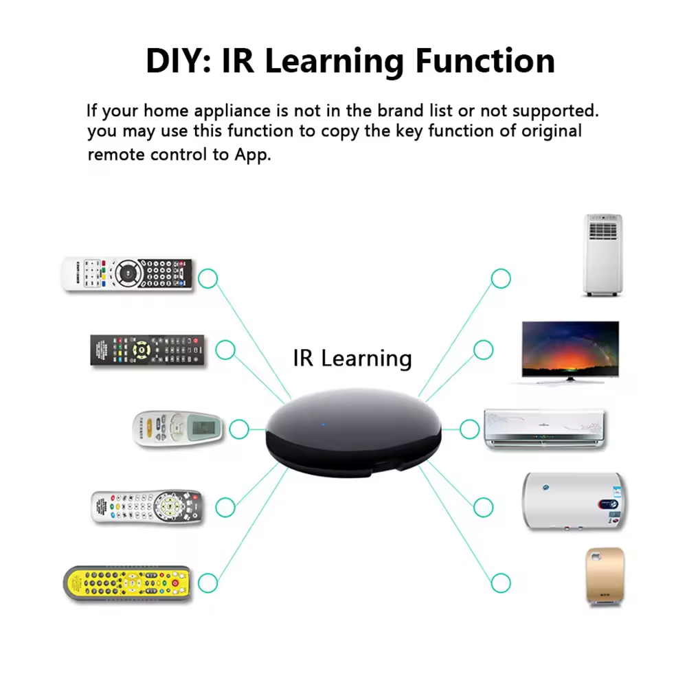 Control your TV, Air Conditioner, DVD/ Bluray Player, Sound System, Set-top Box, TV Box, Fan, Light, Projector, Heater, Purifier, Curtain Motor, or any Device that uses an IR Remote Controller.