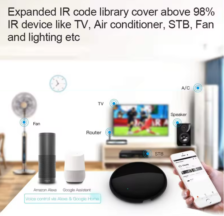 Control your TV, Air Conditioner, DVD/ Bluray Player, Sound System, Set-top Box, TV Box, Fan, Light, Projector, Heater, Purifier, Curtain Motor, or any Device that uses an IR Remote Controller.