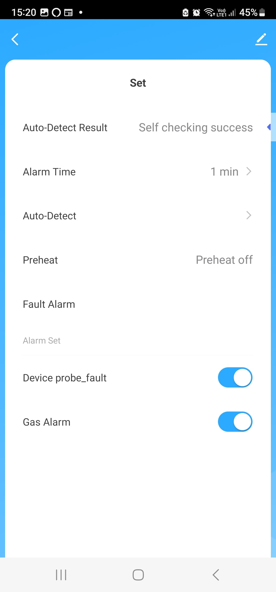 Settings: Auto Detect Result | Alarm Time | Auto Detect | Preheat | Fault Alarm.