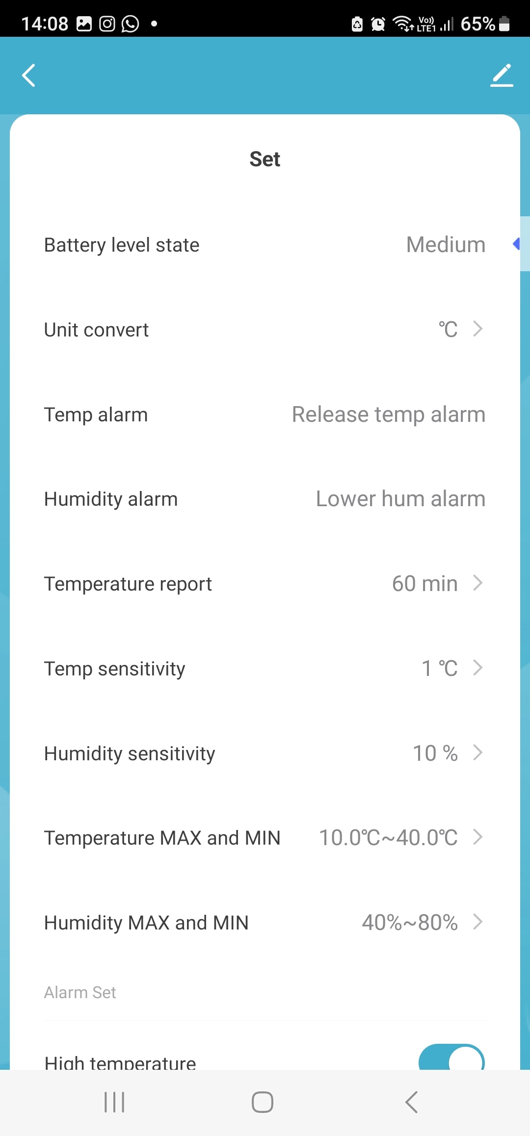 Settings: Battery Level State | Unit Convert (°C or °F) | Temp Alarm | Humidity Alarm | Temperature Report (to the app in interval of 30min) | Temperature Sensitivity | Humidity Sensitivity | Set Temperature Minimum and Maximum | Set Humidity Minimum and Maximum.