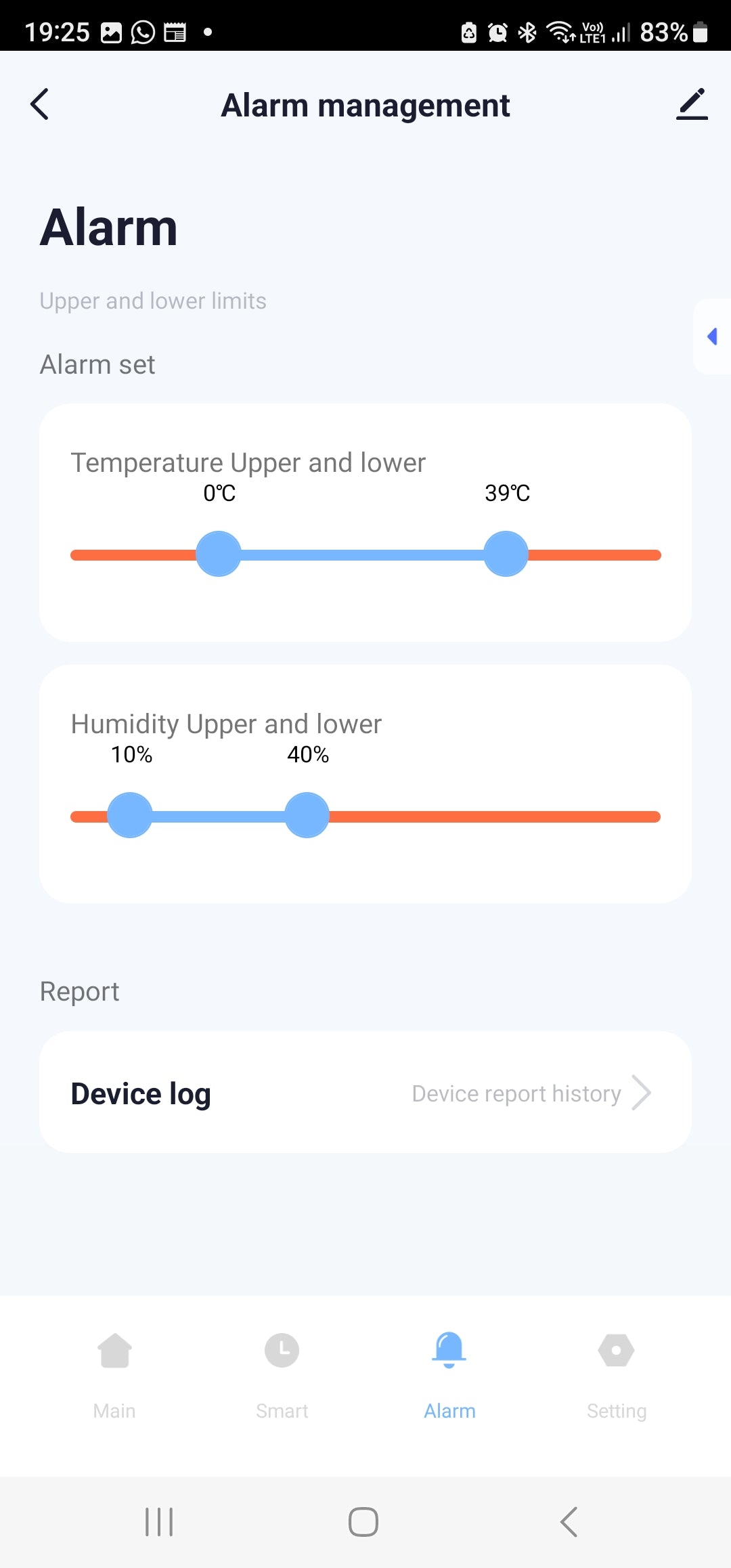 Alarm: Set Temperature and humidity Upper and Lower Alarm values and View Device Logs.