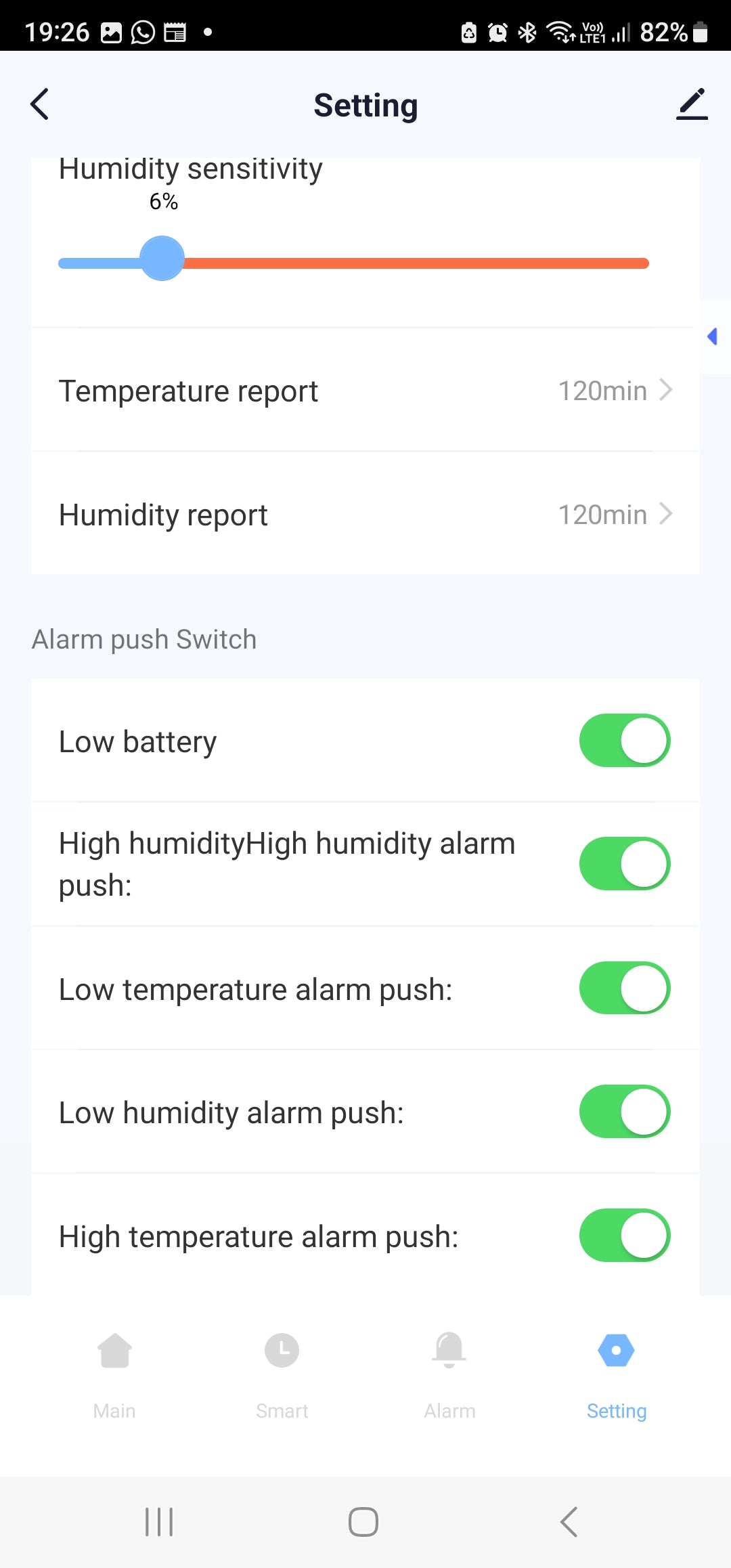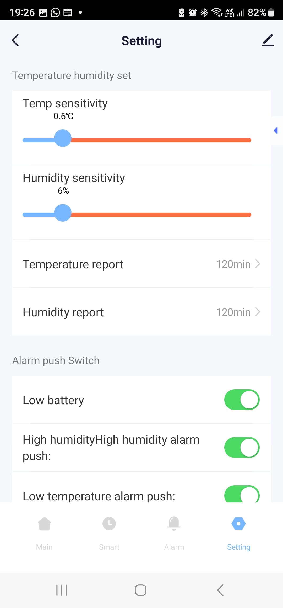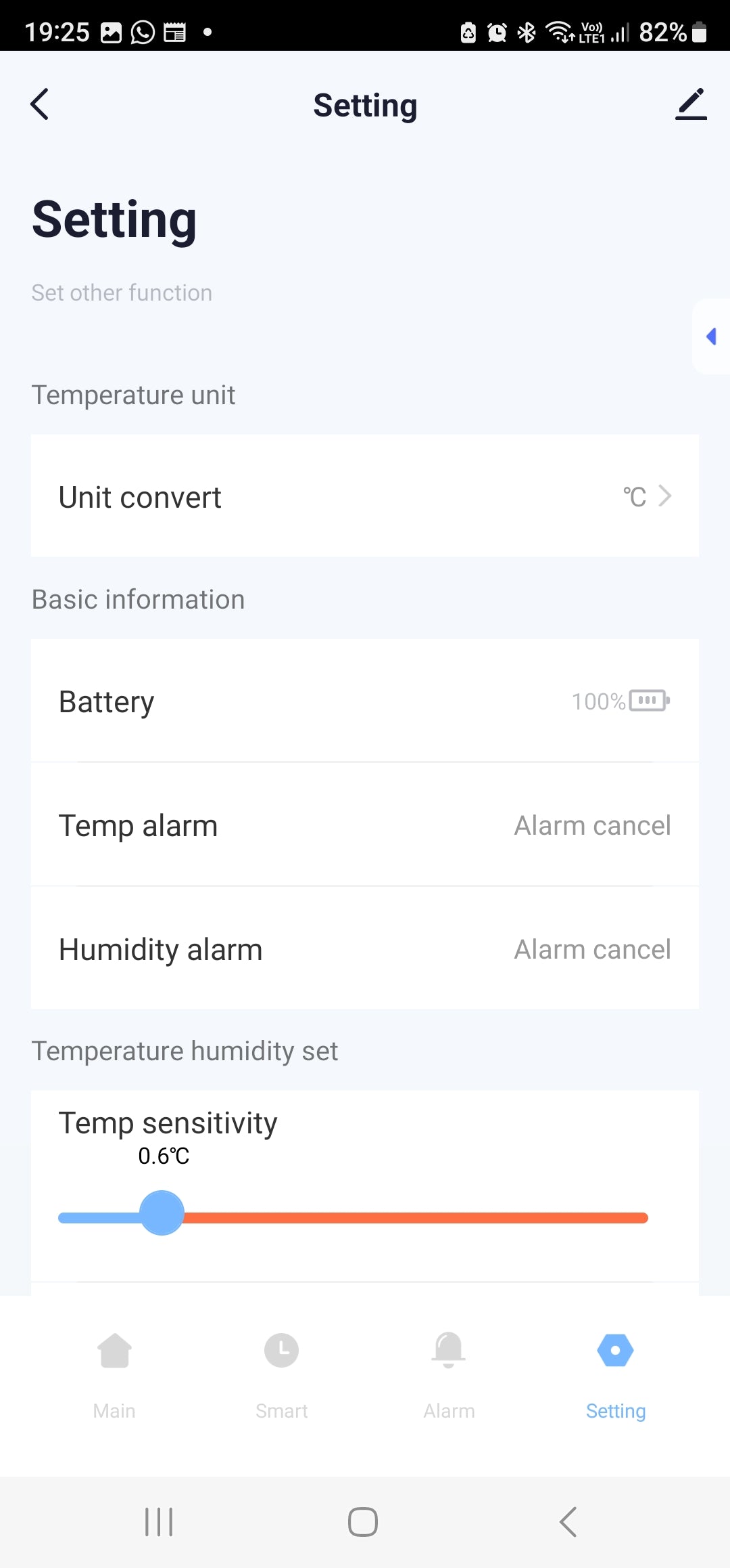 Settings: Temperature Unit Conversion (°C or °F) | Battery Level Percentage | Temperature and humidity Alarm | Temperature & Humidity Sensitive & report rate (To the app) | Low Battery, Low Humidity, Low Temperature, High humidity Alarm Enable or Disable.