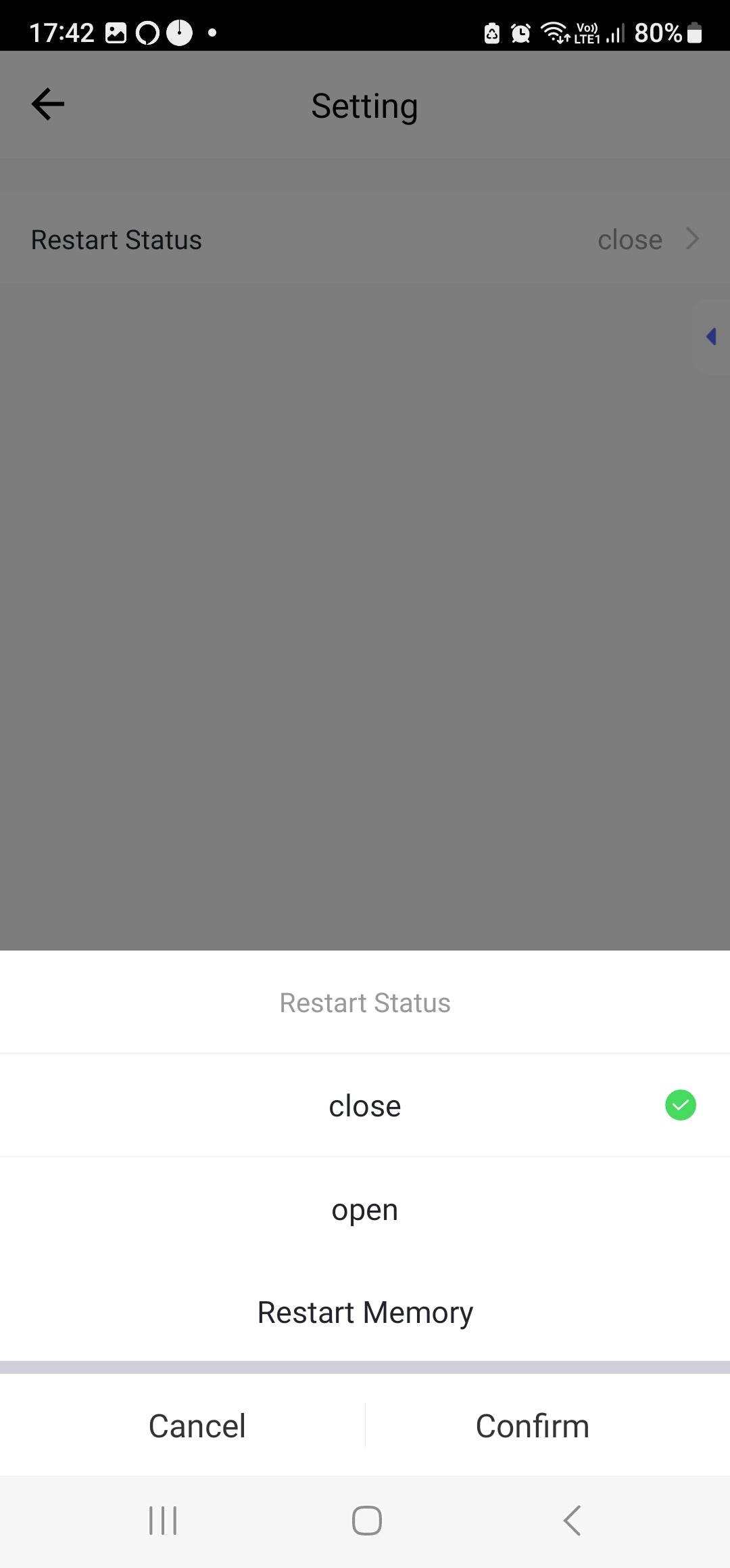Settings: Restart Status (Close, Open, Memory). After the Power cut of this switch then the switch turns on with the selected Status.
