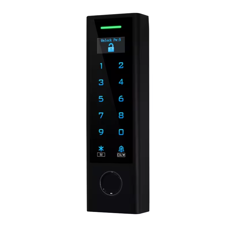 Touch screen Number keypad and Fingerprint Sensor with LED backlighting and Doorbell Button.