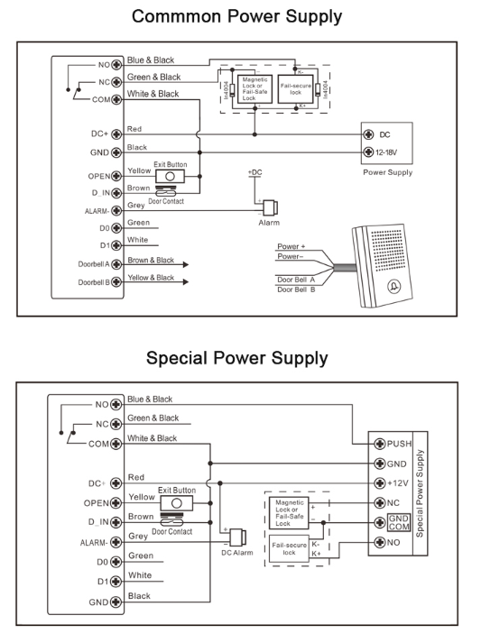 Wiring Connections support Relay Output 2amp max (NO, Common, and NC), Exit Button, Alarm, Door Contact, Wiegand Input, and Wiegand Output.
