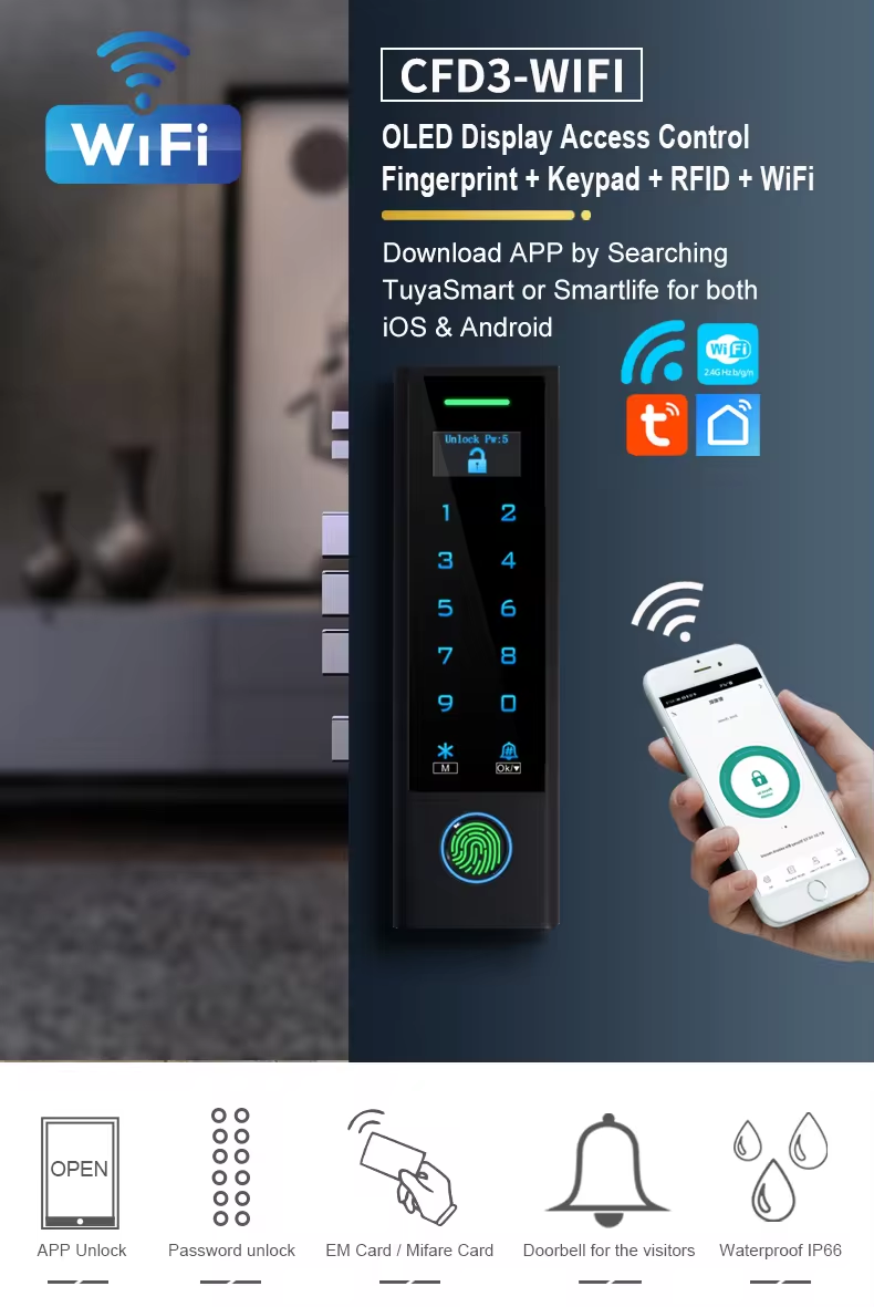 Smart Life Tuya WIFI Waterproof 12V Access Control Fingerprint Keypad Card Doorbell Gate Garage CFD3
