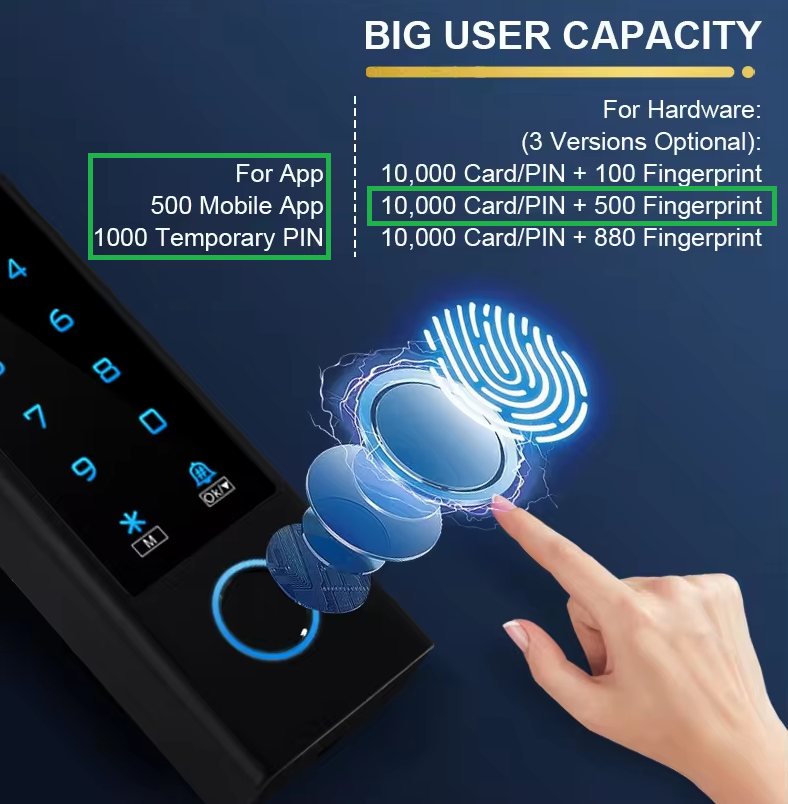 Supports up to 10,000 users including up to 9988 Common Users (500 Fingerprints + 9988 Card/Password users), 10 Visitors, and 2 Panic Users.