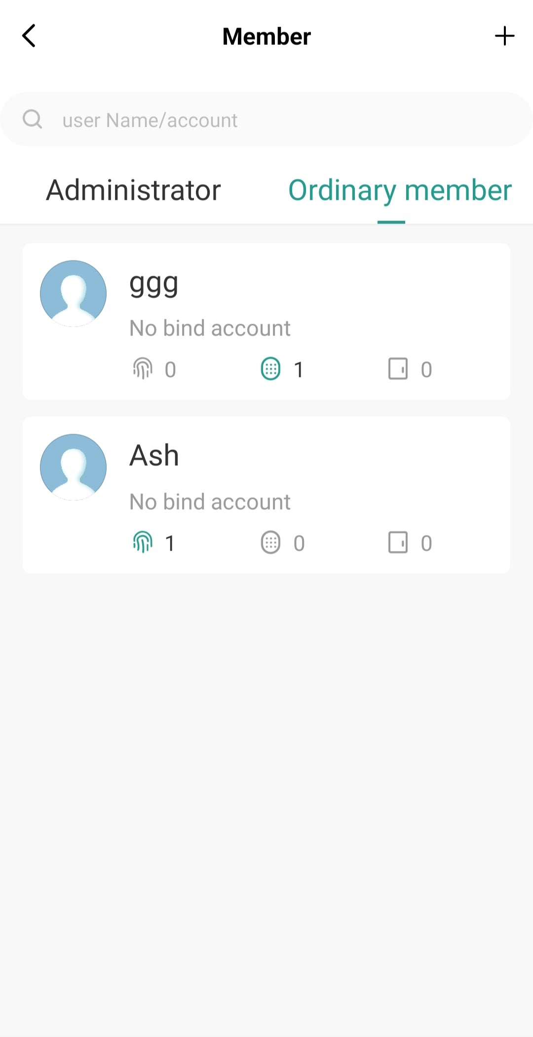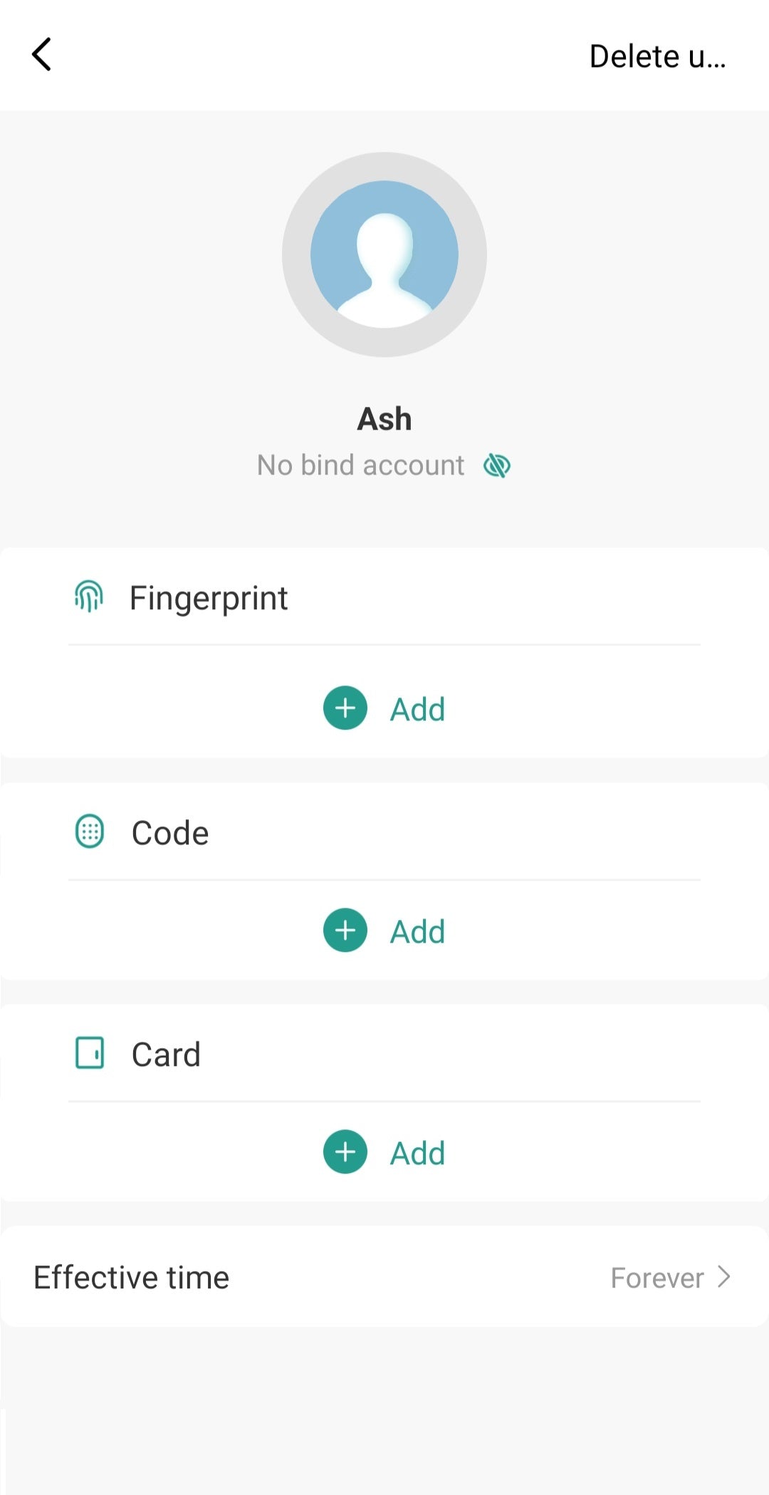 Member Manage: Administrator (Can manage Devices and Members. Must have Tuya or Smart Life app) | Ordinary Member (Can only view Unlock and Alarm records. User can be created without them having the app). Add Multiple codes or Cards under each user Profile. Set an Effective time (Forever or Certain Effective and Expire Date including Repeat certain Days; Monday to Sunday and Start and End times) and Delete the User.