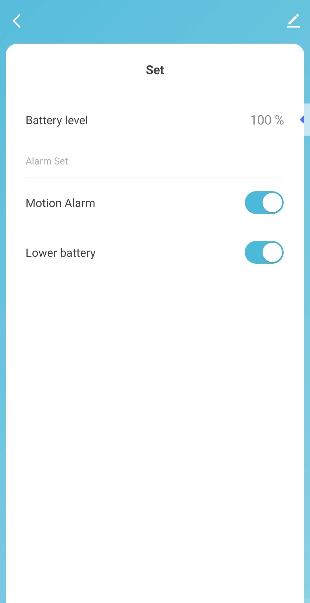 Set: Battery Level % | Motion Alarm (Enable or Disable) | Low Battery Alarm (Enable or Disable).