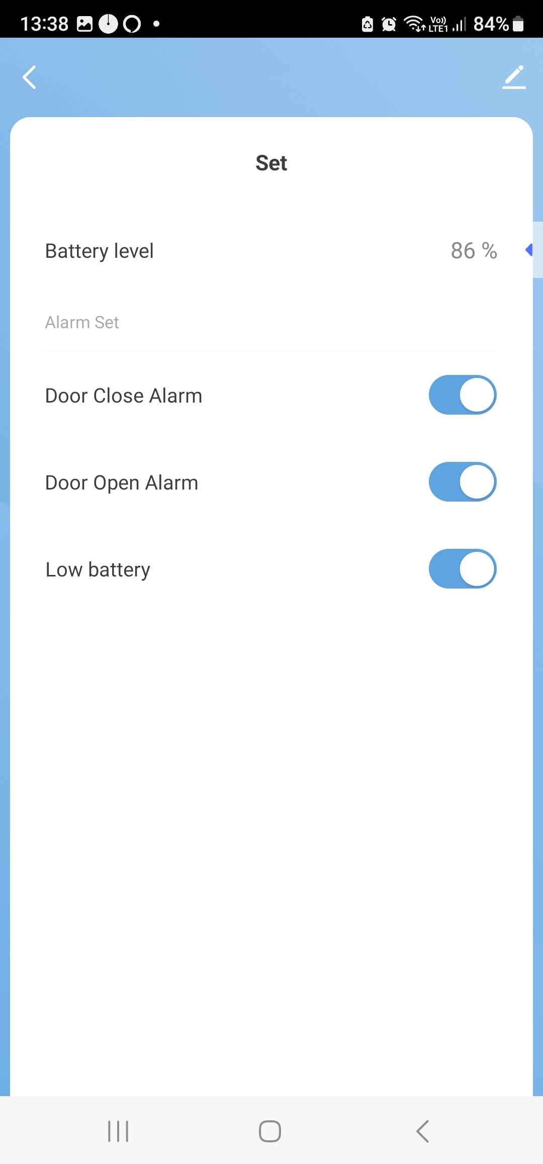 Set: Battery Level % | Door Open Alarm (Enable or Disable) | Door Close Alarm (Enable or Disable) | Low Battery Alarm (Enable or Disable).