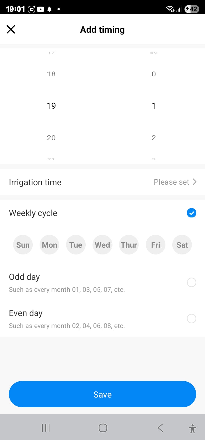 - Timing: Schedule Timed Irrigation Time, Irrigation Time, Choose between Week Cycle or Odd days, or Even Days of the month.